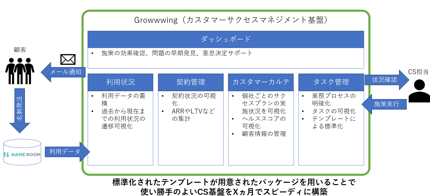 ユニリタが提供する「Growwwing」は、「利用者がサービスを使いこなして、継続的に価値を感じてもらえる」「サービス提供者に利用者の声を届けて、継続的に価値を向上してもらう」ことを実現するカスタマーサクセス管理サービスです。「Growwwing」には、ユニリタが持つ、1,700社以上におよぶ国内有数のお客様へ提供し蓄積されたITサービス運用やデータ活用のノウハウと、当社のサブスクリプションサービスで培われた知見に基づく多彩なテンプレート、そしてSalesforceプラットフォームから提供される機能が集約されています。